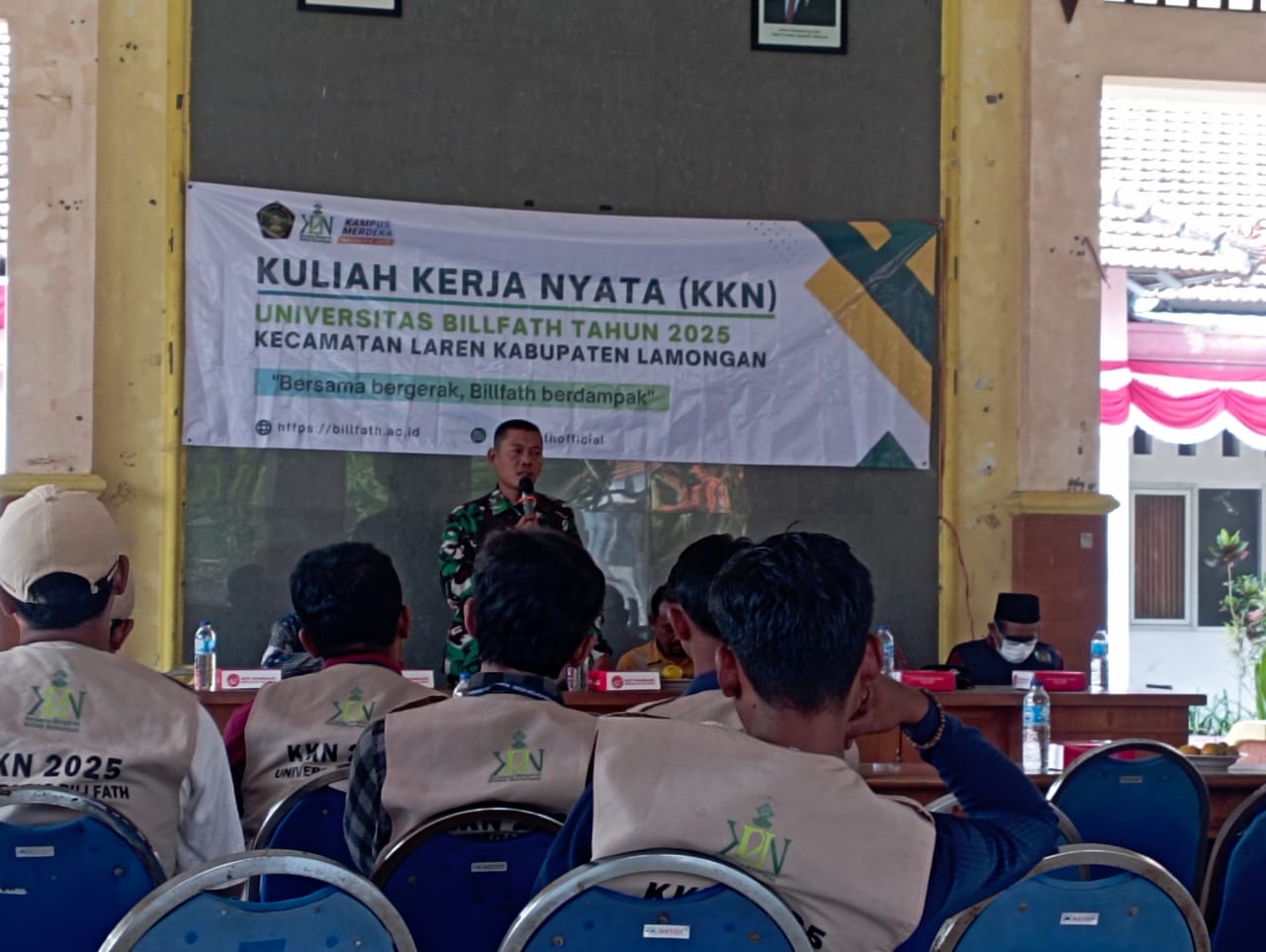 Lamongan, Info Faktual. Com, – PJ Danramil 0812/19 Laren, Pelda Suhdi Prayetno, memberikan pembekalan pada acara penutupan Mahasiswa Kuliah Kerja Nyata (KKN) Universitas Billfath Siman tahun 2025 di Pendopo Kecamatan Laren. Selasa (02 September 2025)