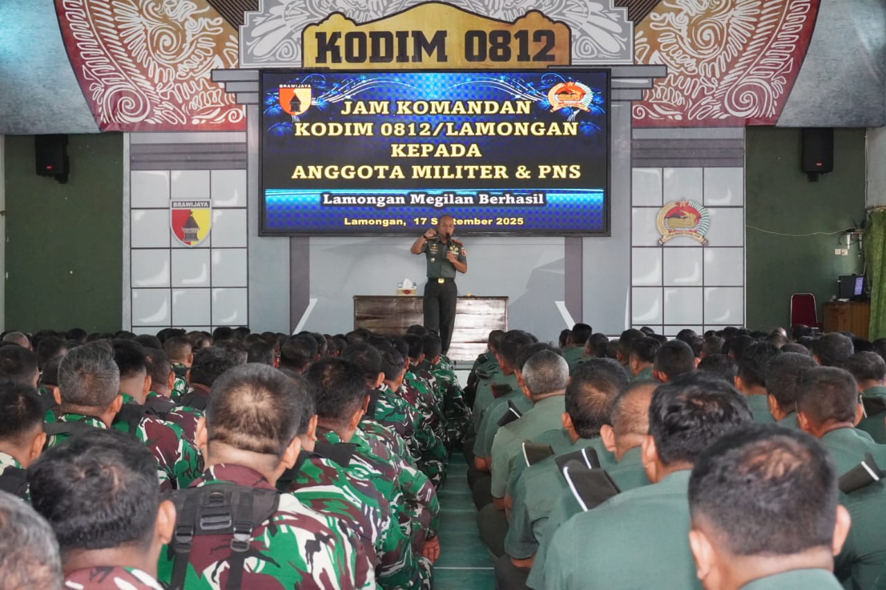 Lamongan, InfoFaktual.com, – Komandan Kodim 0812/Lamongan, Letkol Inf Deni Suryo Anggo Digdo memimpin upacara 17 September 2025 di lapangan upacara Makodim 0812/Lamongan sekaligus memberikan Jam Komandan kepada seluruh anggota Kodim 0812/Lamongan baik Prajurit maupun PNS TNI. Kegiatan jam Komandan dilaksanakan di Aula Kadet Soewoko Kodim 0812/Lamongan, Rabu (17/09/2025).