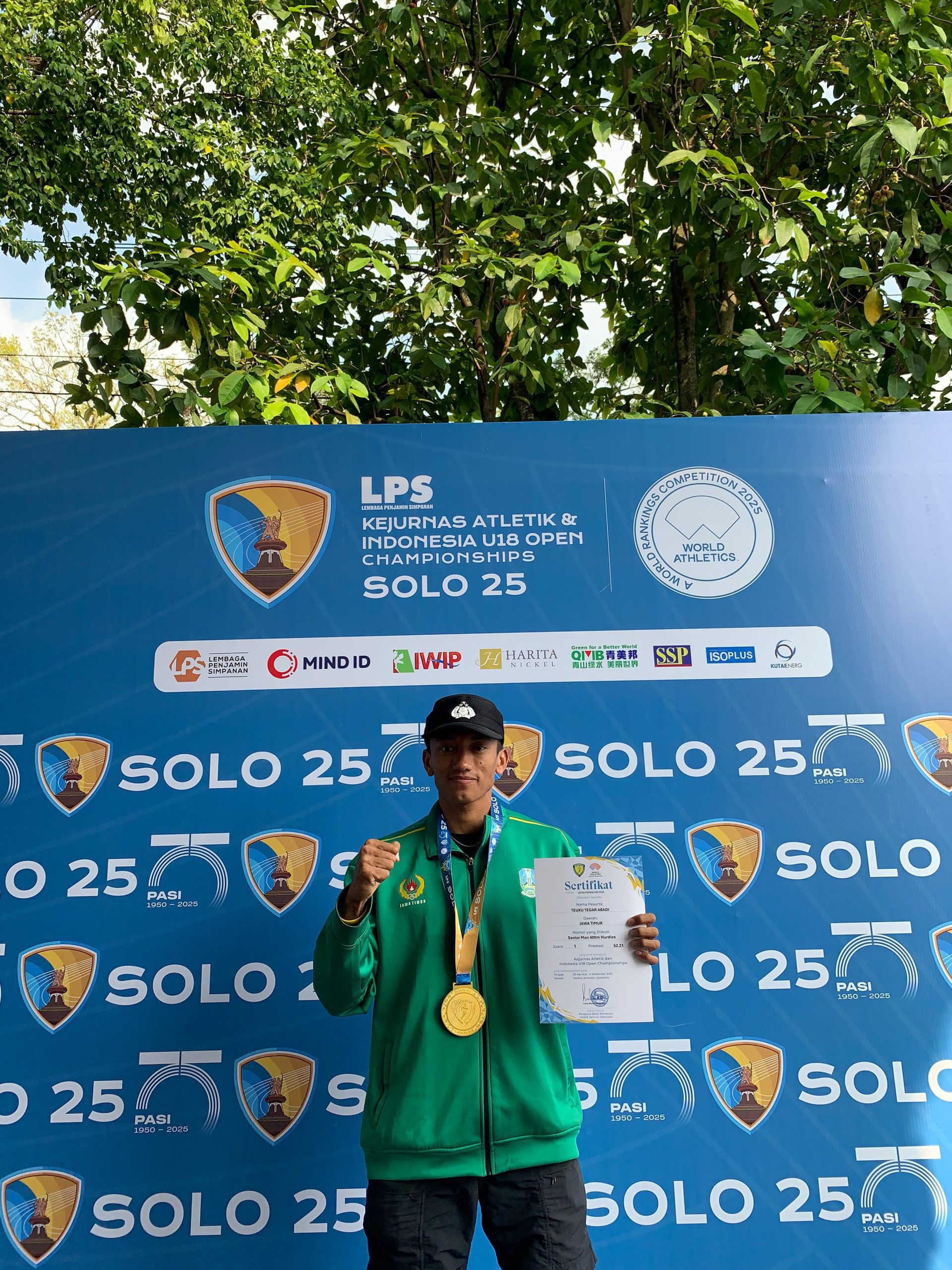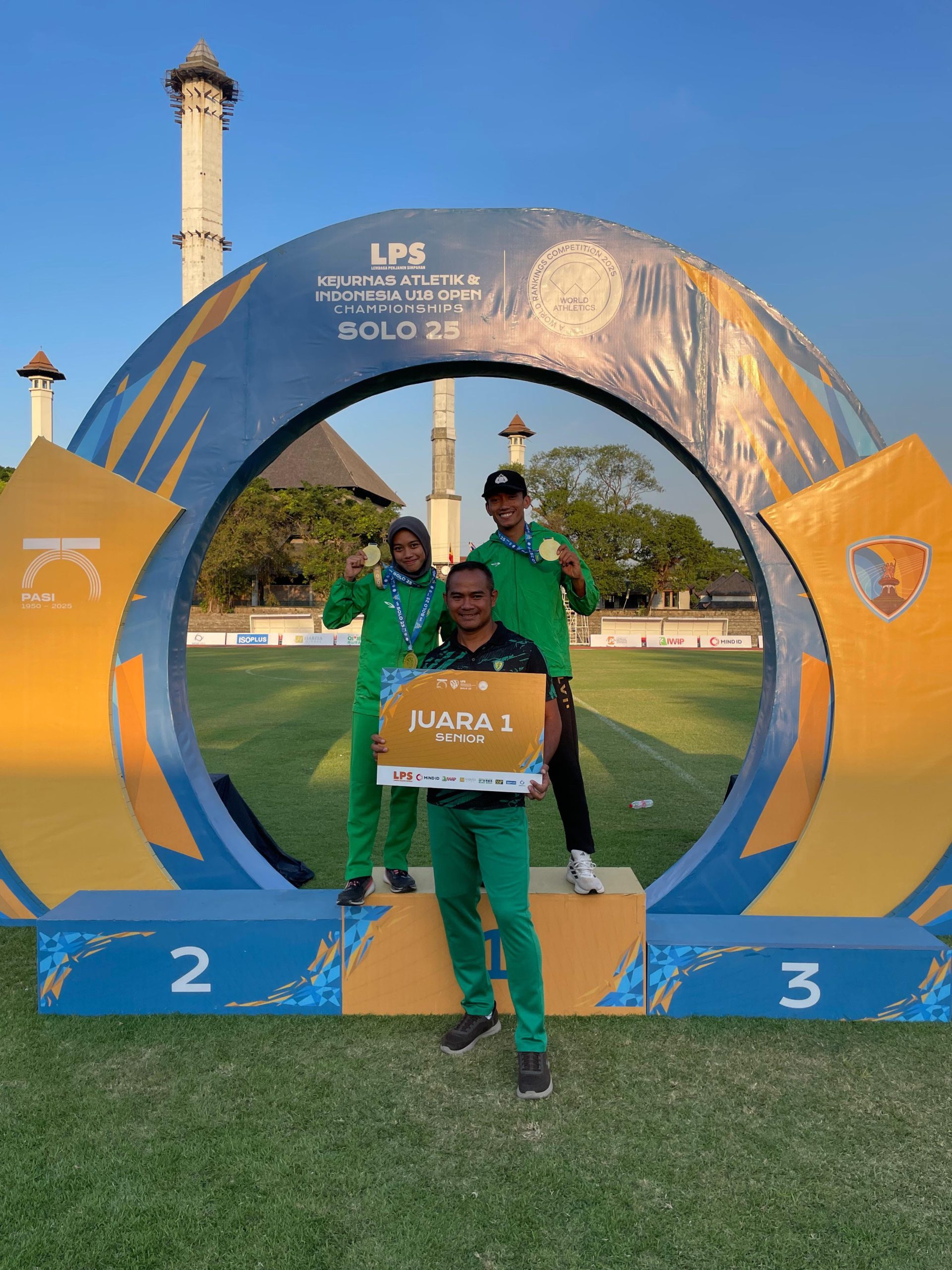 Dengan meraih juara 1 sekaligus membawa pulang medali emas pada ajang Kejuaraan Nasional Atletik dan Indonesia U18 Open Championship yang digelar di Stadion Sriwedari, Solo.