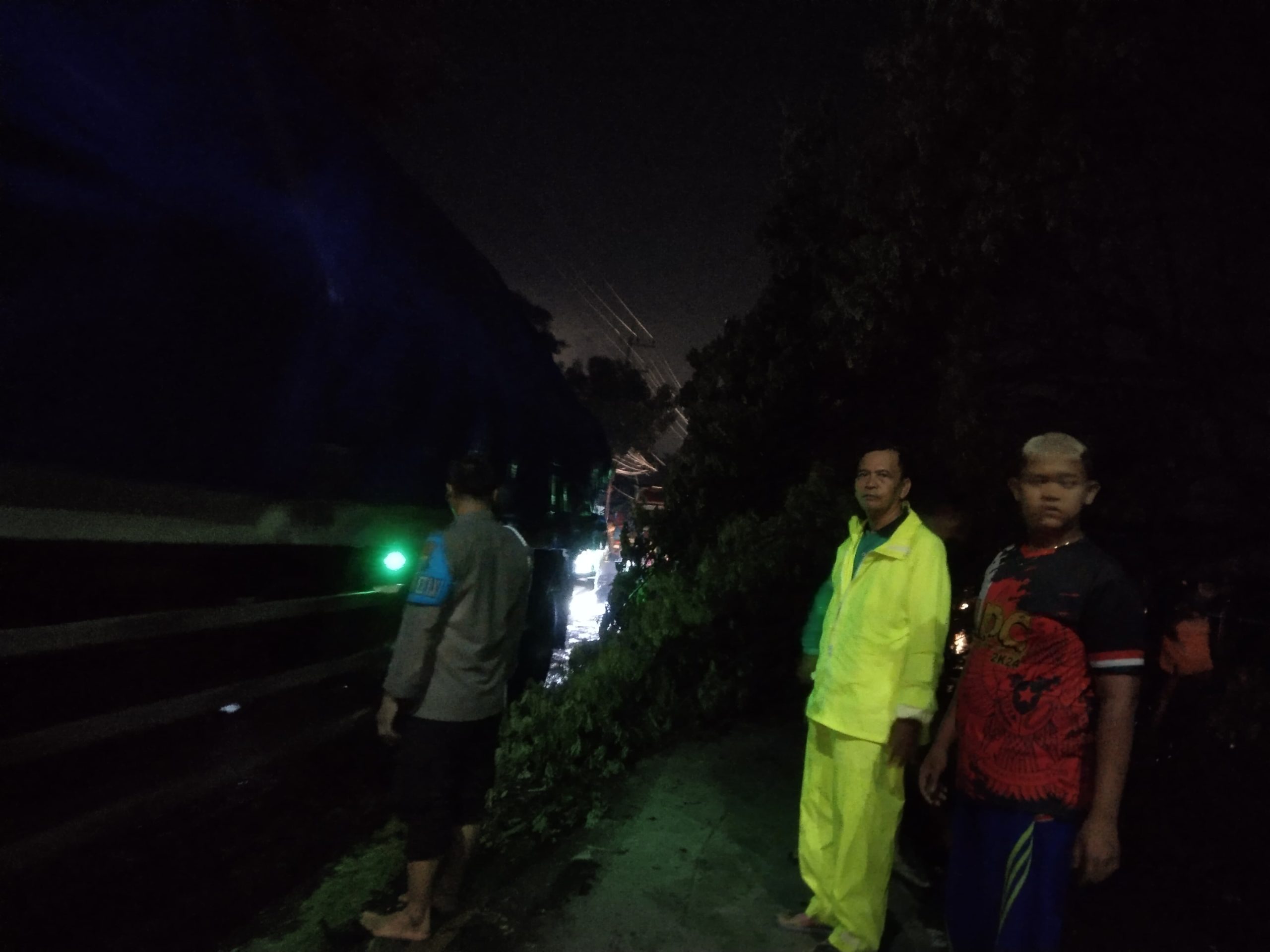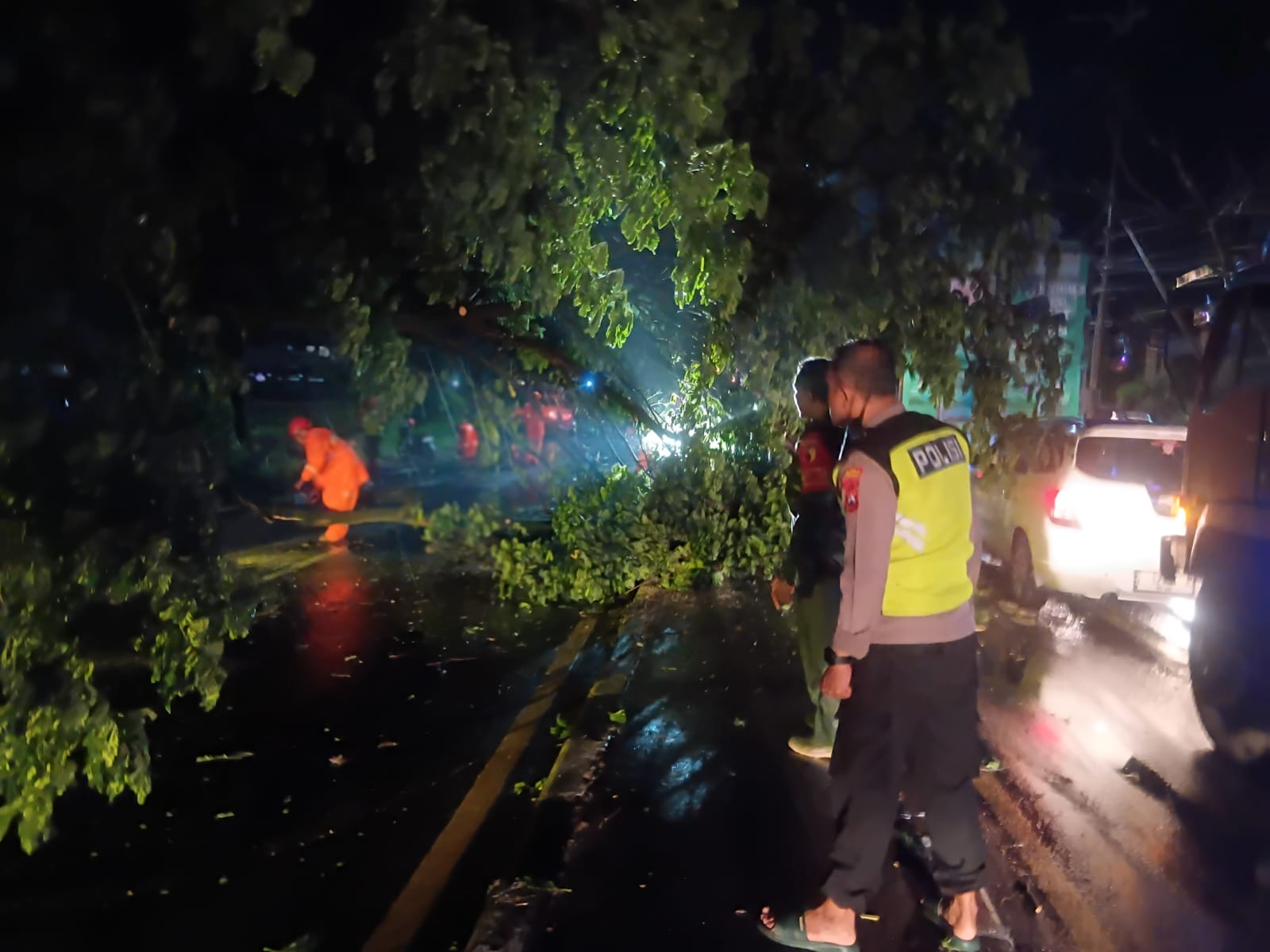 Petugas kemudian melakukan pengaturan arus lalu lintas agar kendaraan dapat bergerak dengan aman, sekaligus melaksanakan pembersihan material pohon tumbang secara gotong royong hingga jalur kembali bisa dilewati.