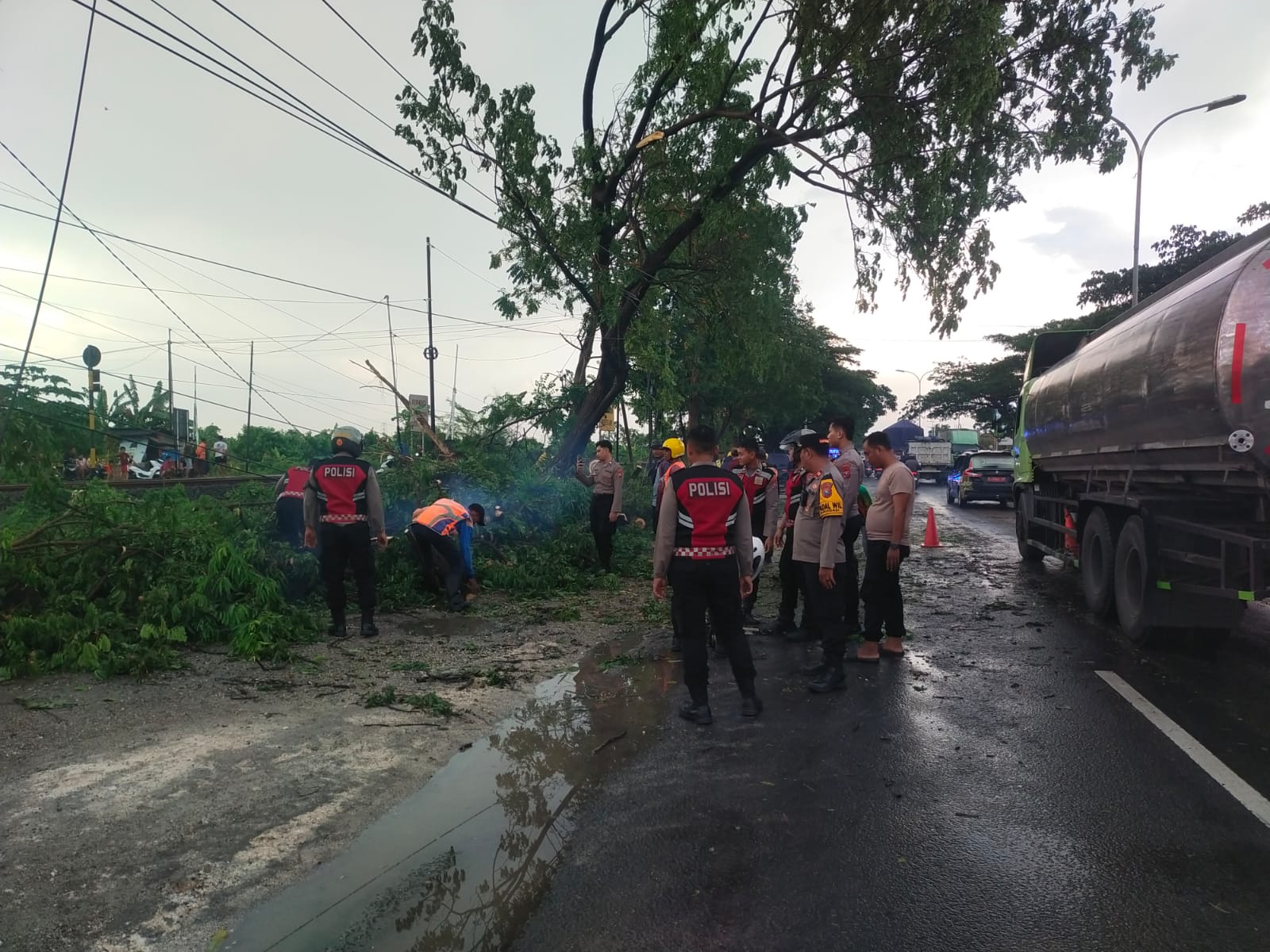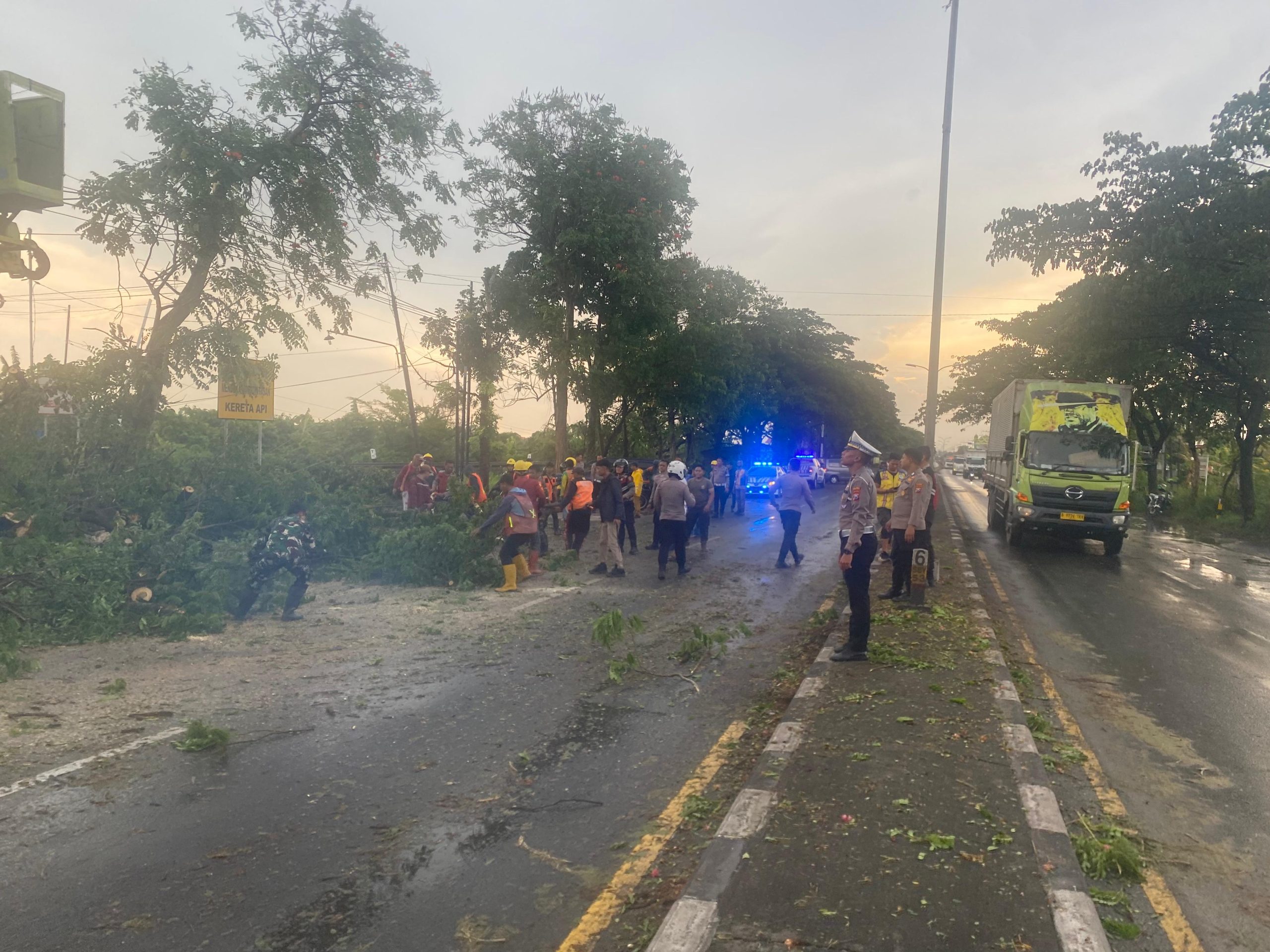 Petugas bergotong royong memotong dan menyingkirkan batang pohon yang melintang di jalan, sekaligus melakukan pengaturan arus lalu lintas guna mencegah terjadinya penumpukan kendaraan.