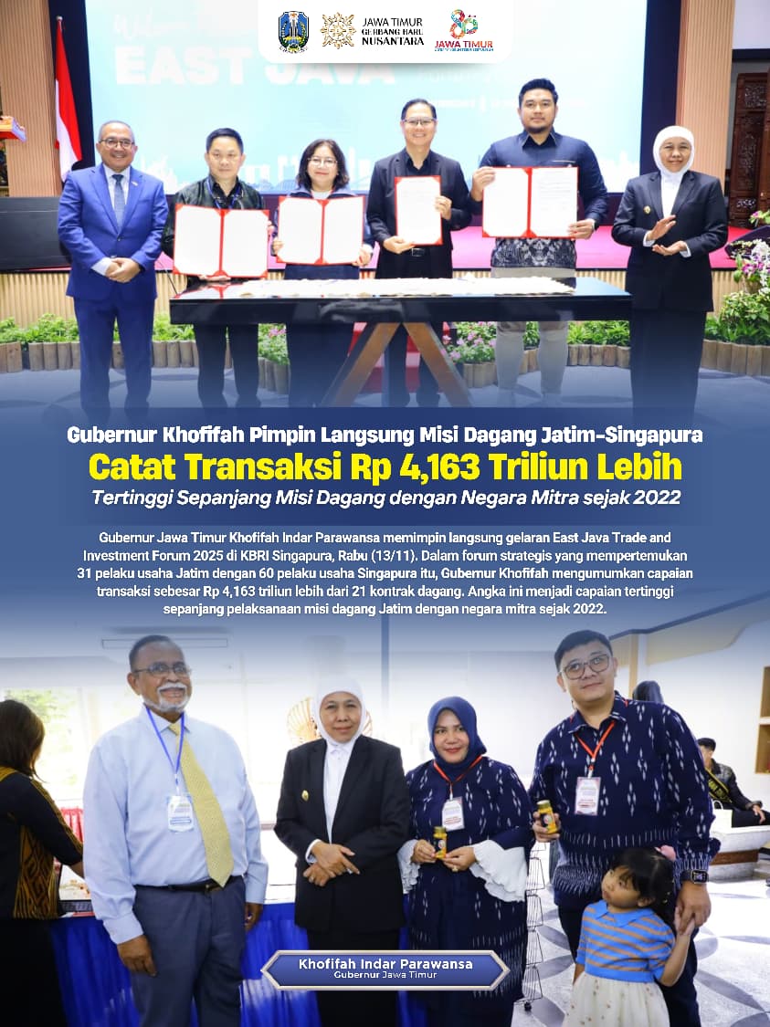 Berlangsung sukses, Misi dagang dan investasi Jatim dan Singapura ini berhasil mencatatkan transaksi gemilang dengan angka Rp. 4.163 Trilliun lebih yang dihasilkan dari 21 transaksi dalam hal tersebut tertinggi Sepanjang Misi Dagang Jatim-Negara Mitra Sejak 2022