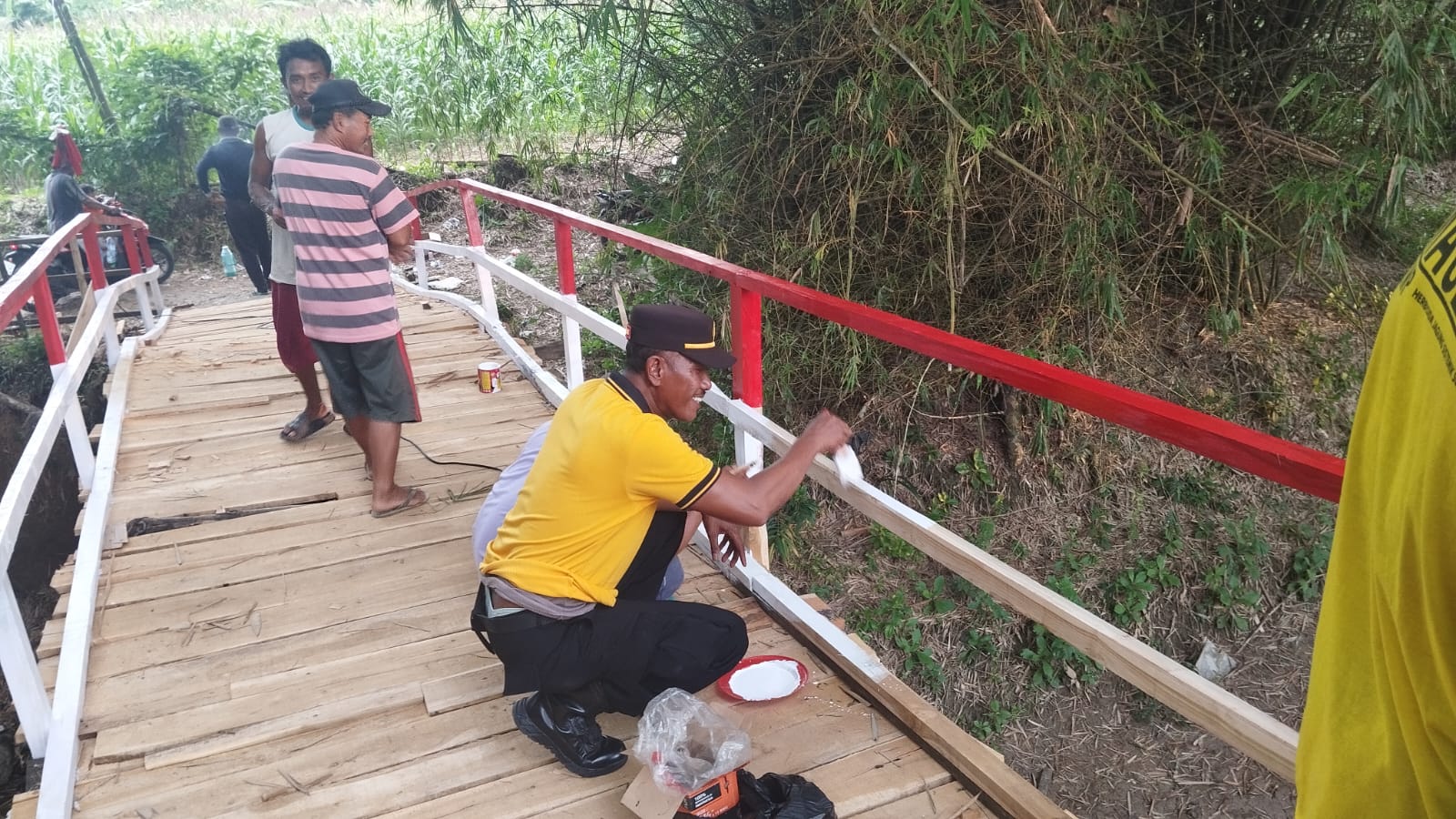 Kali ini, Kapolsek Sambeng bersama anggota dan masyarakat melaksanakan renovasi jembatan di Dusun Gondoroso, Desa Kreteranggon, Jumat (24/04).