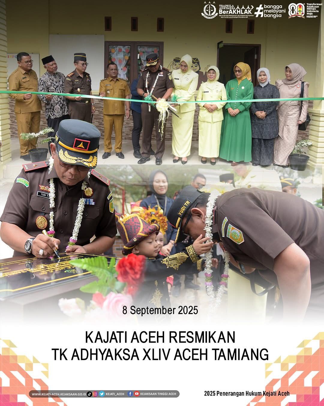 Aceh, Info Faktual.com, – Kepala Kejaksaan Tinggi Aceh, Bapak Yudi Triadi, S.H., M.H., meresmikan Taman Kanak-Kanak (TK) Adhyaksa XLIV Aceh Tamiang, Senin (8/9/2025). Peresmian ini turut dihadiri Wakil Bupati Aceh Tamiang, Ismail, S.E.I., Ketua IAD Wilayah Aceh Ny. Juraida Yudi Triadi, Bunda PAUD Aceh Tamiang Ny. Yuyun Armia, Ketua IAD Daerah Aceh Tamiang Ny. Murti Yudhi Syufriadi, serta jajaran Forkopimda dan para guru TK.