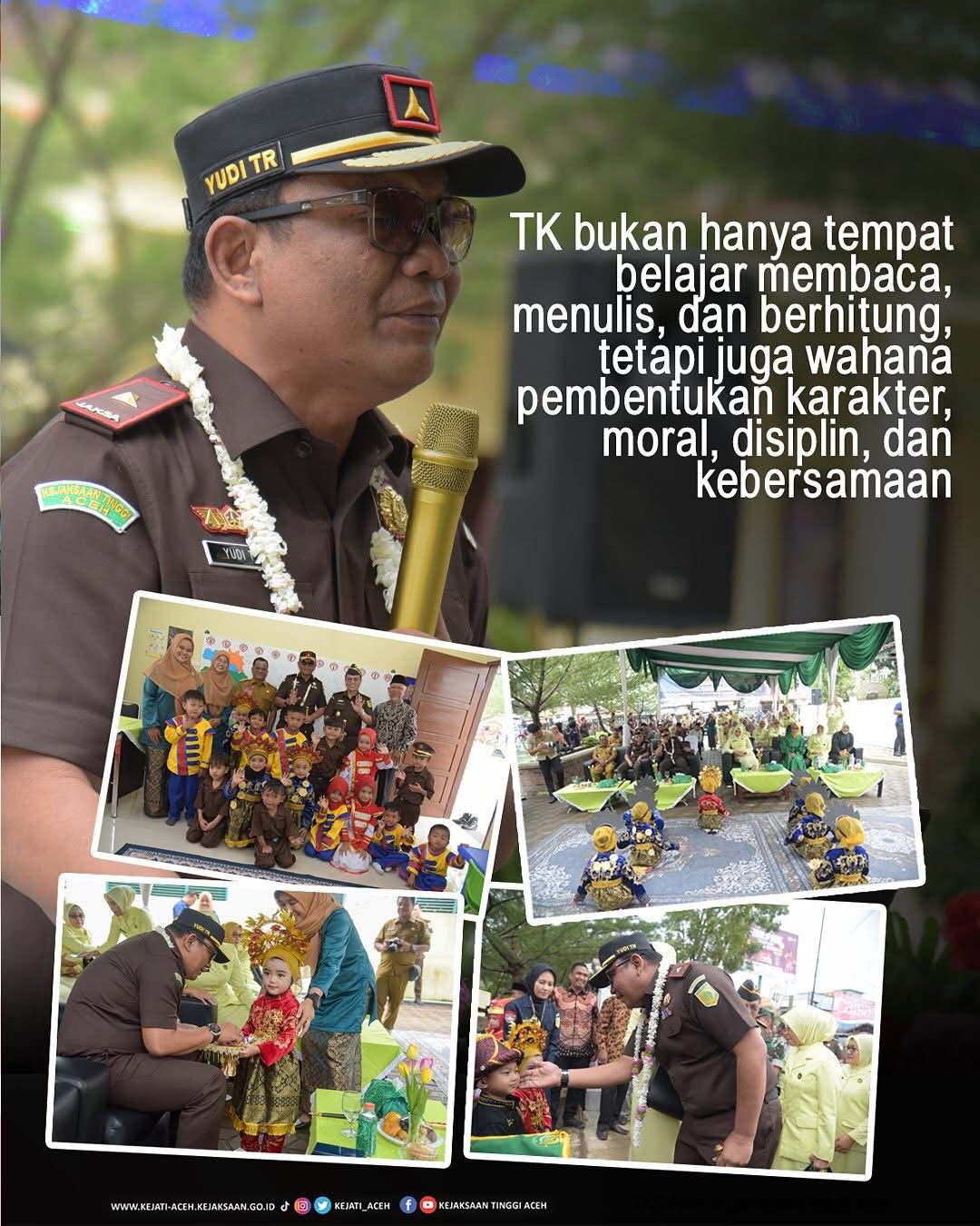 Dalam sambutannya, Kajati Aceh Bapak Yudi Triadi, S.H., M.H.,menegaskan pentingnya pendidikan sebagai pilar utama pembangunan bangsa, terutama pendidikan anak usia dini yang menjadi fondasi intelektual, emosional, spiritual, dan sosial anak. “TK bukan hanya tempat belajar membaca, menulis, dan berhitung, tetapi juga wahana pembentukan karakter, moral, disiplin, dan kebersamaan,” ujarnya.