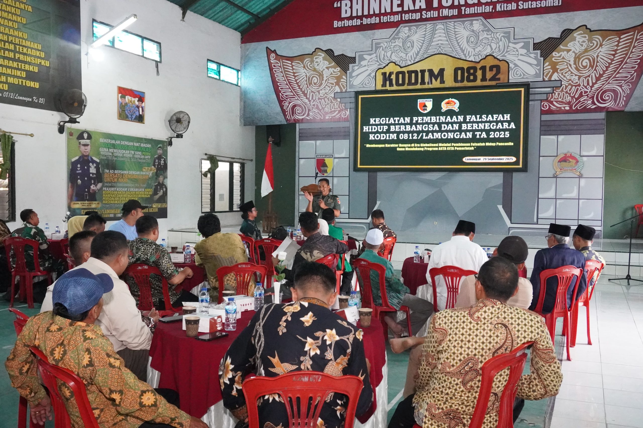Acara yang mengusung tema “Membangun karakter Bangsa di era Globalisasi melalui pembinaan falsafah hidup Pancasila guna mendukung program Asta Cita Pemerintah” ini dihadiri oleh berbagai elemen penting di Kabupaten Lamongan, menunjukkan sinergi yang kuat antara TNI dan seluruh komponen bangsa. Peserta yang hadir meliputi Tokoh Agama, Tokoh Masyarakat, Tokoh Pemuda, masyarakat umum, Kepala Dinas Kesbangpol Lamongan, perwakilan Banser Ansor, Komponen Cadangan (Komcad), SPPI, dan Pemuda Pancasila. Selasa (30/09/2025)