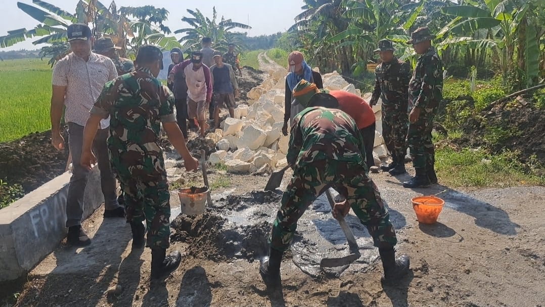 Lamongan, InfoFaktual.com, –Koramil 0812/01 Kota Lamongan sukses menggelar kegiatan Karya Bakti Satuan Komando Wilayah (Satkowil) Tahun 2025. Kegiatan gotong royong ini berfokus pada pembangunan Tembok Penahan Tanah (TPT) di jalan utama Desa Sendangrejo, Kecamatan Lamongan, sebagai upaya mitigasi dan pencegahan erosi.