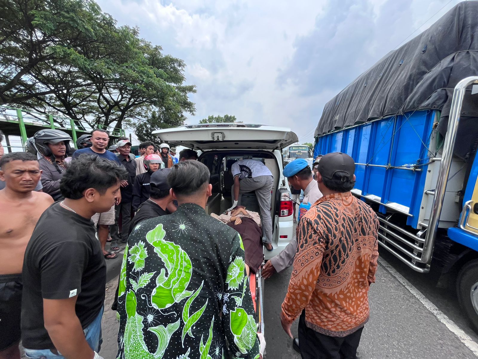 Namun, ketika proses mendahului berlangsung, sepeda motor tiba-tiba oleng dan terjatuh ke kiri hingga masuk ke kolong truk.