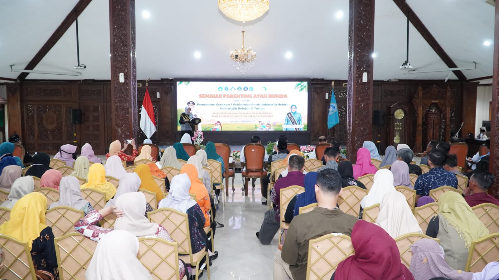 “Pemerintah hadir dan bersungguh-sungguh dalam keberhasilan realisasi gerakan tujuh Kebiasaan Anak Indonesia Hebat (KAIH) dan wajib belajar (Wajar) tiga belas tahun,” tutur Bupati Lamongan Yuhronur Efendi saat membuka seminar parenting ayah bunda dala rangka penguatan gerakan tujuh Kebiasaan Anak Indonesia Hebat (KAIH) dan wajib belajar (Wajar) tiga belas tahun, Rabu (24/9) di Pendopo Lokatantra.