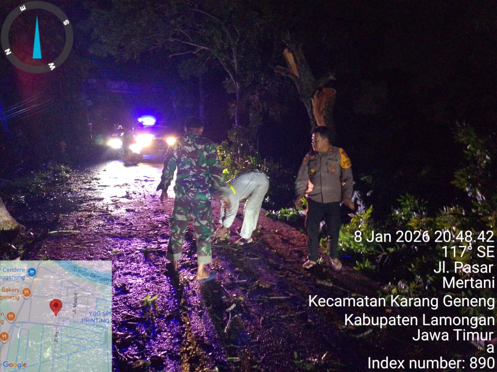Kasihumas Polres Lamongan IPDA M. Hamzaid, S.Pd menjelaskan bahwa terdapat dua peristiwa yang terjadi di wilayah Kecamatan Karanggeneng pada Kamis malam (08/01) pada saat hujan deras disertai angin kencang.