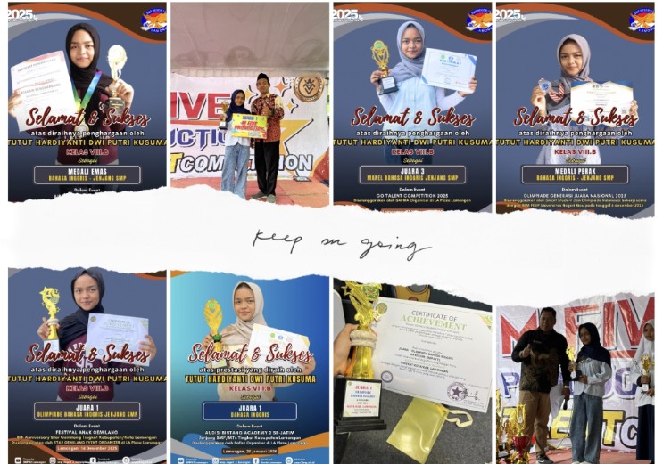 Juara pertama di raih Tutut Hardiyati Dwi Putri Kusuma kelas VIII B asli Putri daerah, berasal dari Desa Kawistolegi Kecamatan Karanggeneng Kabupaten Lamongan. Tidak hanya itu, kurang lebih dalam kurun waktu satu bulan kembali berhasil menyabet 4 Prestasi di bidang bahasa Inggris dan bervariatif dari juara 3 sampai juara pertama, sungguh prestasi patut di banggakan.