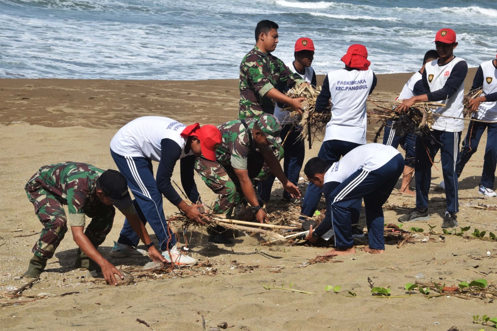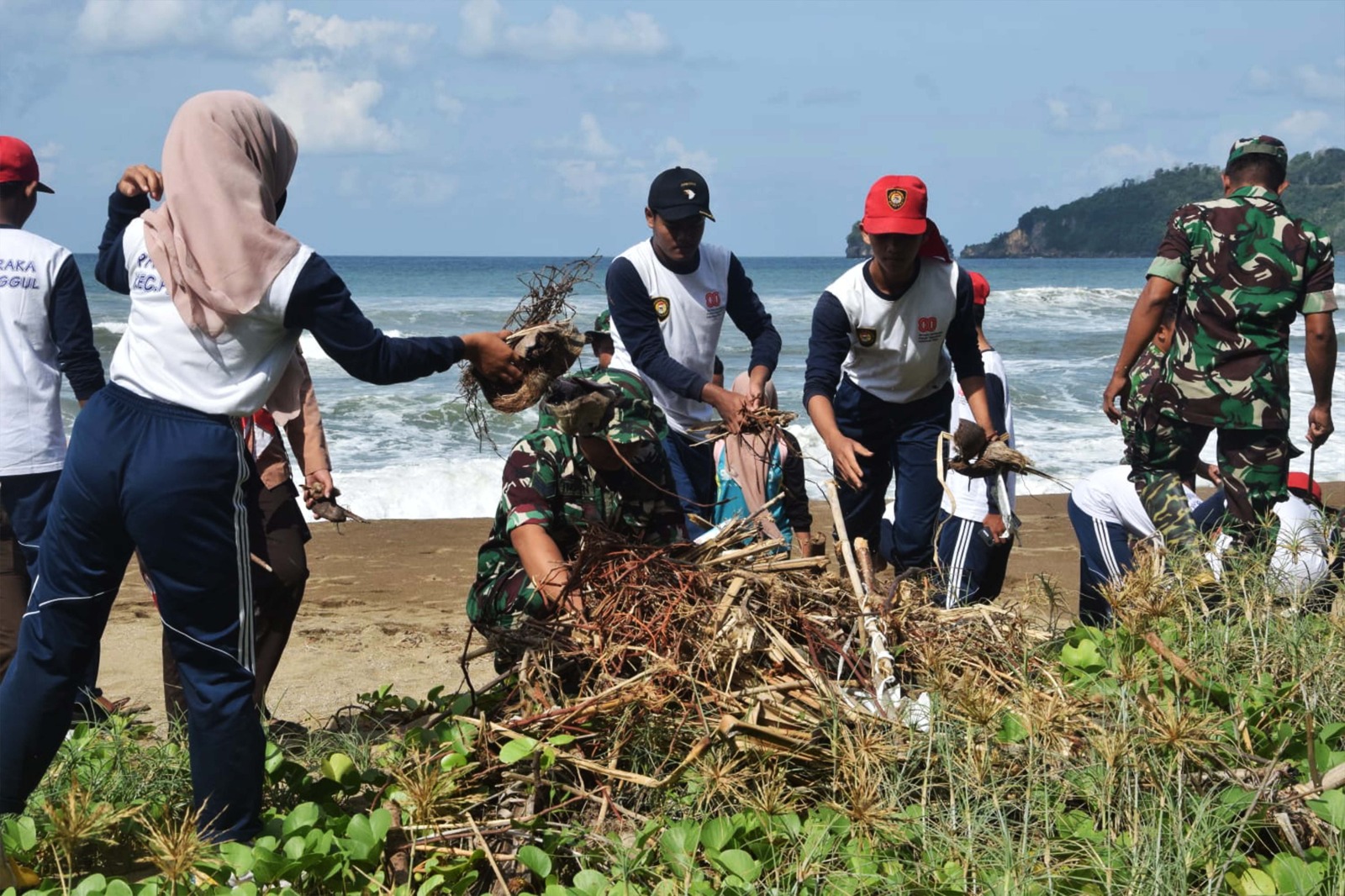 Aksi gotong royong itu berlangsung penuh keakraban. Prajurit TNI, anggota Pokdarwis, dan masyarakat bahu-membahu membersihkan area pantai, mulai dari sampah plastik, dedaunan kering, hingga limbah yang terbawa arus laut. Kolaborasi lintas elemen ini menjadi bukti nyata bagaimana kerja sama mampu menghadirkan manfaat langsung bagi lingkungan dan warga.